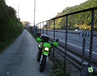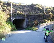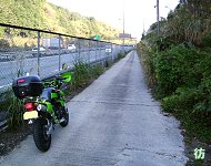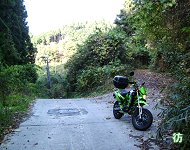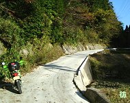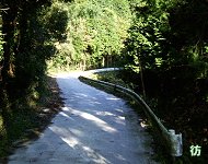 急勾配の坂を上りきった所は名阪国道脇だった。西行き車線(名古屋→大阪方面車線)側なので、名阪国道の南側に出たことになる。場所的には、福住ICと高峰PAの中間ぐらいの位置だ。道は1車線幅の狭路。しかもコンクリート舗装の道なので、どうみても管理道にしか見えない。名阪国道は頻繁に走っているので、この道の存在には気づいていたが、その道が実は県道であったことに驚いた。 左側には高いフェンスが設置されており、国道と県道とを明確に分けている。向こう側は自動車専用道路なので当然の処置と言えるかも知れない。フェンスの向こうを100k/h前後で爆走する車やトラックとすれ違いながら、距離にして約150mぐらいの併走区間をゆっくりと走る。時々、こちらを見て驚いているドライバーと目が合うのがおもしろい。「なんでこんな道走っているのだ?」という表情をしている。 名阪国道から離れると坂道を上り桜峠を通り抜ける。急坂区間はここで終わり、これより東は平坦な狭路となって進んで行く。 名阪国道脇から400mほど山中の狭路を進むとT字路に出た。ここから先は平坦なローカル県道区間になる。 |